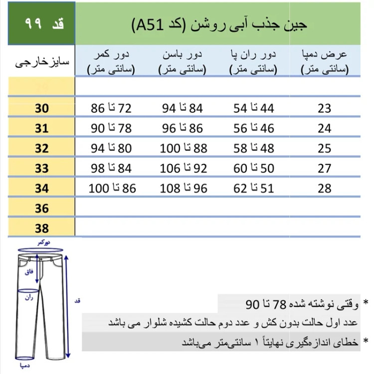 👖جین به فرم دمپاجذب (لوله تفنگی) ✅️ فاق بلند ✅️ پارچه کشی و با تن خور شیک سایز 30 جدول : سایز 38 ایرانی سایز 31 جدول : سایز 40 ایرانی سایز 32 جدول : سایز 42 ایرانی سایز 33 جدول : سایز 44 ایرانی سایز 33 جدول : سایز 46 ایرانی