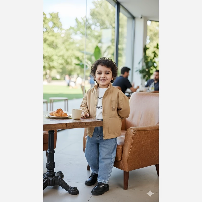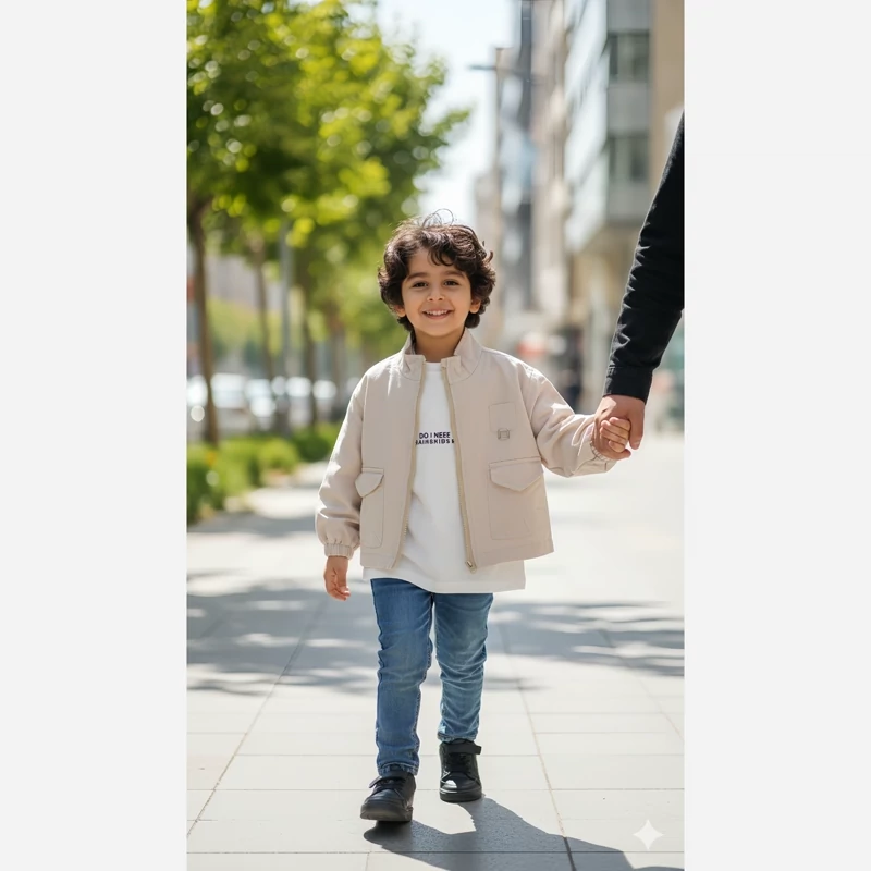 ست تیشرت با کت پاییزه اسپرت جنس تیشرت نخ پنبه 100٪ جنس کت کتان پنبه داخل آستردار مناسب 1 تا 6 سال به فرم لش و قوارهدار باکسی در سه رنگ کرم استخوانی و کرم نسکافهای و سبز کیفیت درجه یک و تضمینی